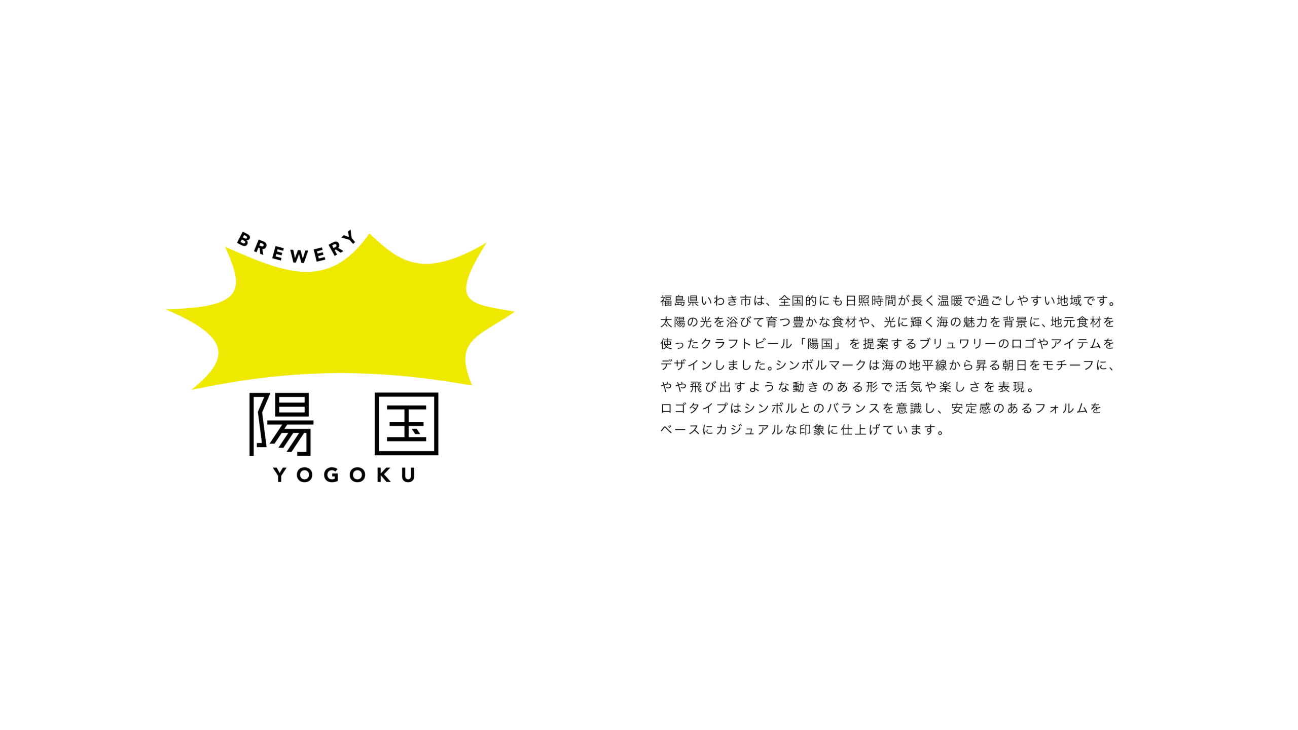 福島県いわき市のクラフトビールブランド「陽国」のロゴやビールラベル、ショッパー、グラス、名刺などをデザインしました。日照時間が長く温暖ないわき市の特徴から、地平線から昇る朝日をシンボルマークに採用。太陽が持つ明るさや活気、楽しさといったイメージをブランド全体のビジュアルに展開しました